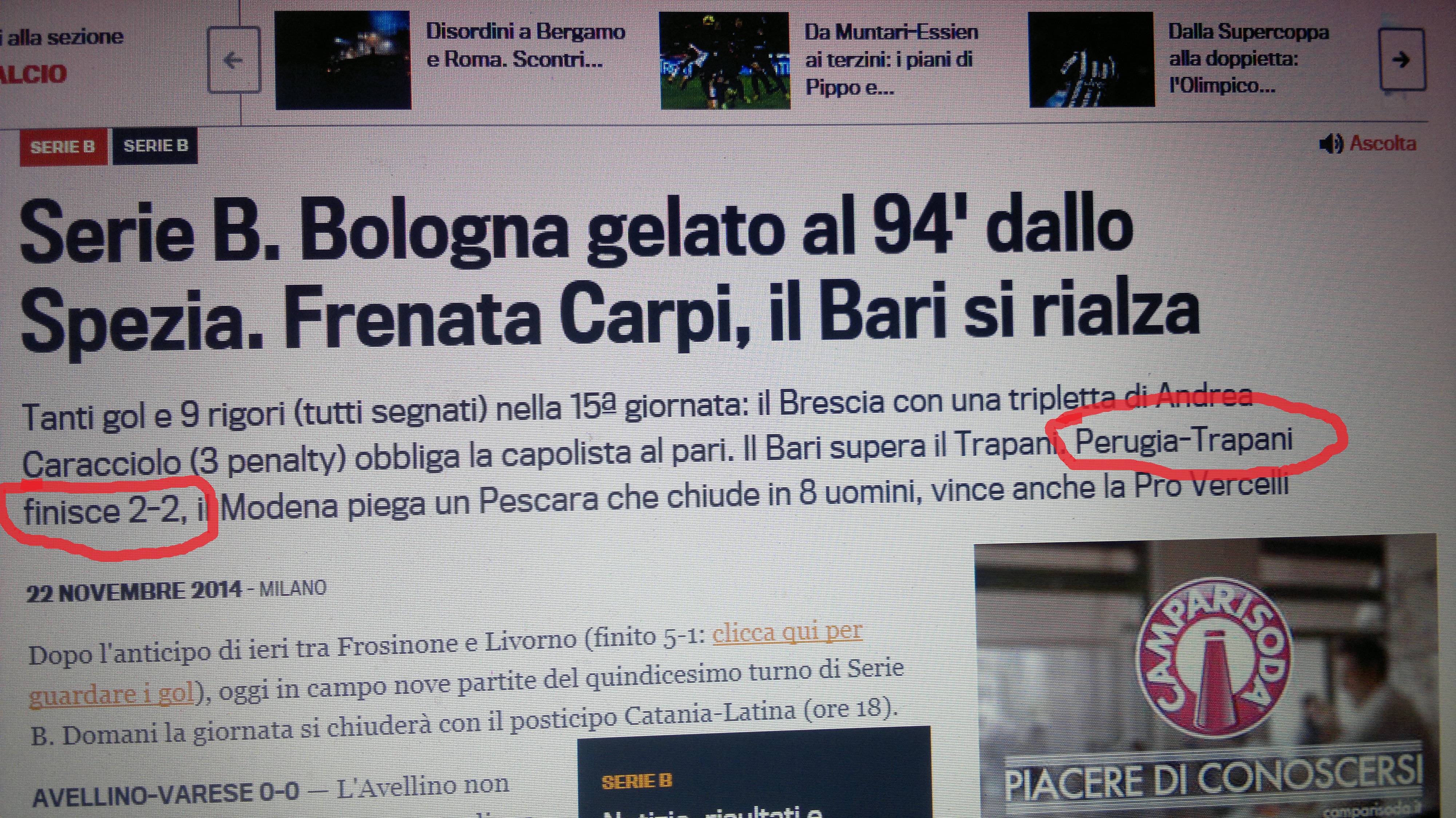 Capisco che la Ternana non si può nemmeno nominare, ma non pensavo che alla Gazzetta dello Sport fossero così tanto perugini. Non riescono nemmeno a scriverla… Per loro il Perugia ha pareggiato 2-2 contro il Trapani, che però ha giocato in contemporanea anche contro il Bari. Lo dice proprio la riga prima…